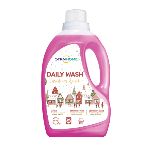 El DAILY WASH CHRISTMAS SPIRIT de Stanhome es un detergente líquido concentrado en edición limitada, diseñado para lavar y eliminar manchas de la ropa diaria con solo 35 ml por lavado. Su fórmula eficaz es adecuada para prendas blancas y de color, proporcionando una limpieza profunda y un aroma fresco y amaderado que celebra el espíritu navideño.